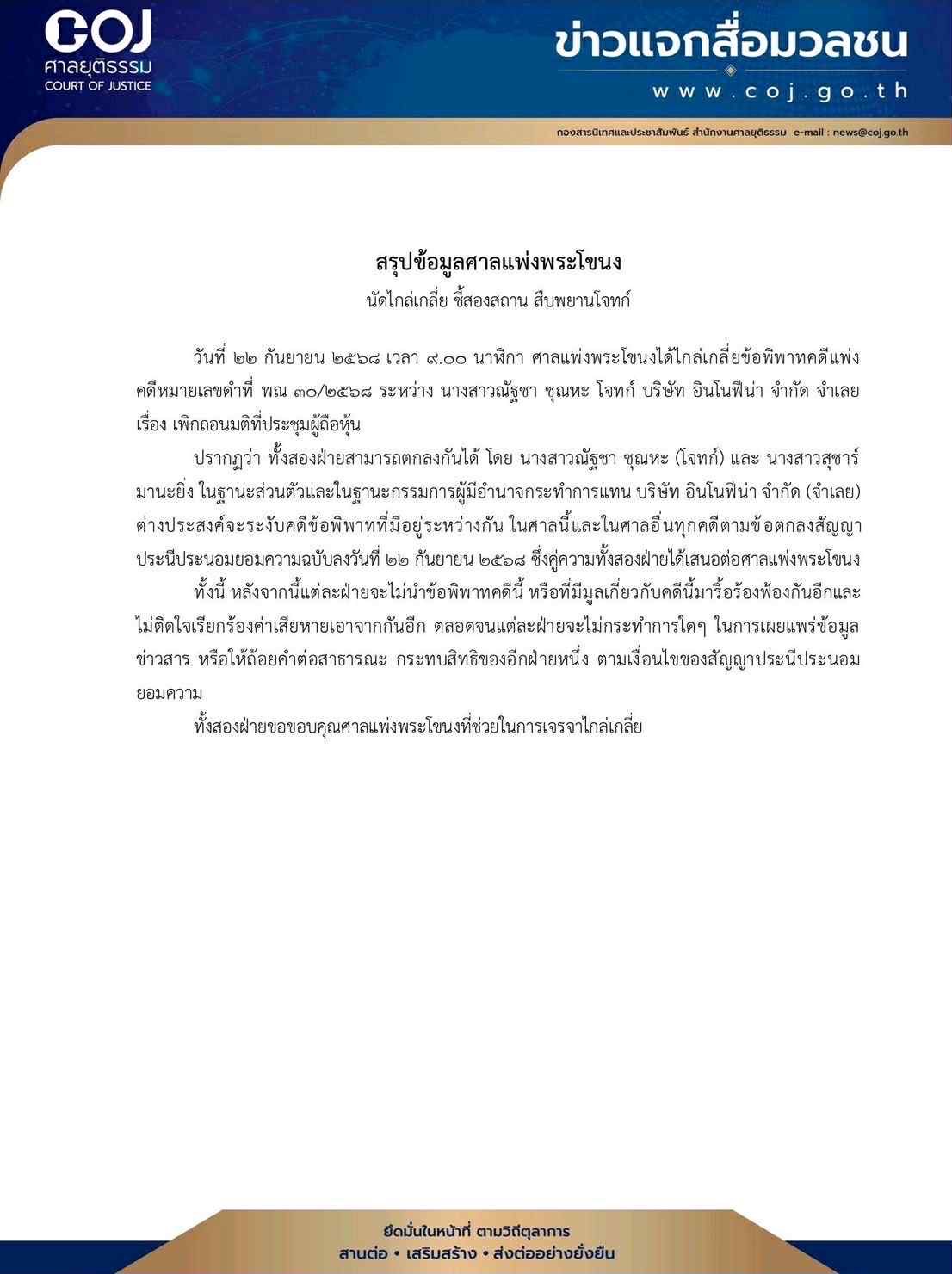 ศาลแพ่งพระโขนง ได้ไกล่เกลี่ยข้อพิพาทคดี ระหว่าง นางสาวณัฐชา ชุฌหนะ บริษัท อินโนฟีนา จำกัด จำเลย เรื่อง เพิกถอนมติที่ประชุมผู้ถือหุ้น ปรากฎว่า ทั้งสองฝ่ายสามารถตกลงกันได้ โดย นางสาวณัฐชา ชุฌหนะ(โจทก์) และ นางสาวสุภาวดี มานะยิ่ง ซึ่งในฐานะส่วนตัวและในฐานะกรรมการผู้มีอำนาจกระทำแทน บริษัท อินโนฟีนา จำกัด (จำเลย) ต่างประสงค์จะประนอมคดีข้อพิพาทที่มีอยู่ระหว่างกันในคดีนี้และในคดีอื่นทุกคดีของสัญญาประนีประนอมยอมความฉบับลงวันที่ ๒๒ กันยายน ๒๕๖๘ ซึ่งทั้งสองฝ่ายได้เสนอต่อศาลแพ่งพระโขนง