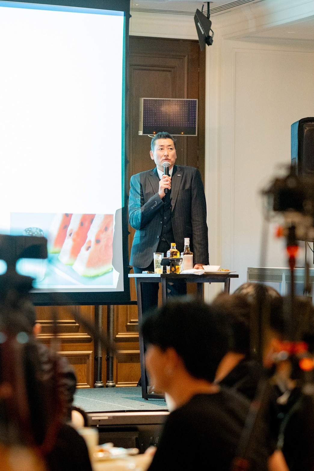 คุณไทชิ ซาซากิ กล่าวว่า “ประวัติของวิสกี้เริ่มตั้งแต่ 100 ปีมาแล้ว อย่างที่ทุกคนทราบกันดีว่าวิสกี้เป็นที่ชื่นชอบของคนทั้งโลก ไม่ว่าจะเป็น สก็อต ไอริส (Scot-Irish) ก็จะมีวิสกี้เป็นของตัวเอง ญี่ปุ่นก็เหมือนกัน แล้วยังมีวัฒนธรรมที่เป็นเอกลักษณ์เป็นของตัว วิสกี้ของญี่ปุ่นที่สะท้อนปรัชญาและแนวคิด เนื่องจากเราเป็นประเทศที่มีอากาศร้อนชื้น เราอาจจะชอบอะไรที่เย็นๆ Highball จึงเหมาะมาก ๆ สุดท้ายอยากให้ดื่มตามใจของทุกคน เราดื่มเพื่อความบันเทิง อยากให้ลองใส่รสชาติที่ตัวเองคิดว่าชอบและสามารถทดลองด้วยตัวเองได้เลย เช่น ใส่มะนาว ใส่ส้มยูซุ หรือผลไม้อย่างอื่นก็ได้ ให้ปรับรสชาติตามที่ตัวเองชอบได้เลย ซึ่ง Highball เข้ากับอาหารแทบทุกชนิดเลย โดยเฉพาะอาหารญี่ปุ่นจะเข้ากับวิสกี้มากๆ อย่าง Highball กับ ไก่ทอดคาราเกะ หรือจะเป็น Highball กับ เกี๊ยวซ่า ทำไมถึงเลือกให้คู่กับอาหารที่รสชาติค่อนข้างแรงและมีน้ำมันเยอะ เขาจะช่วยล้างปาก (wash effect) แล้วทำให้อาหารที่เรากินต่อไปจะอร่อยขึ้นกว่าเดิม”